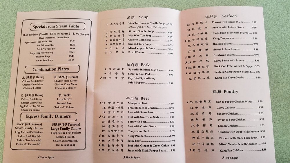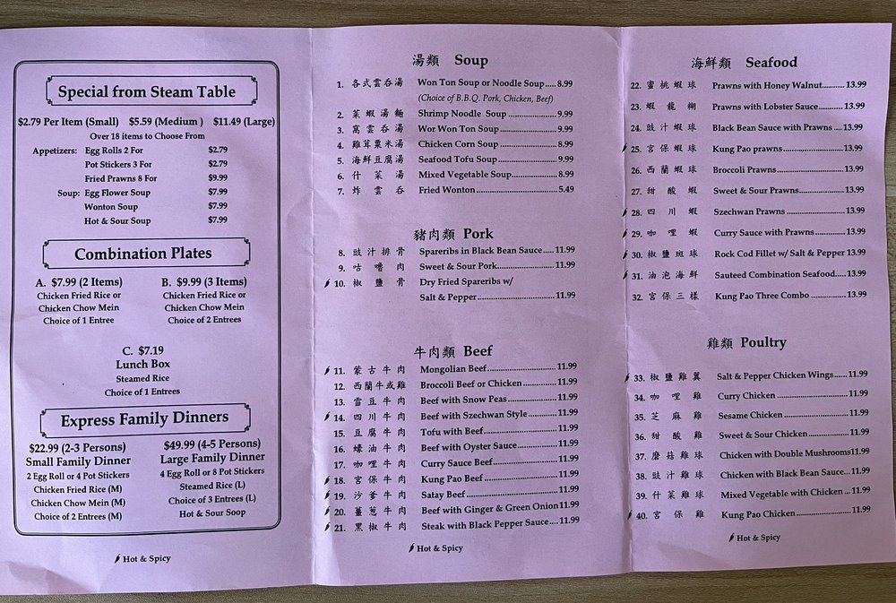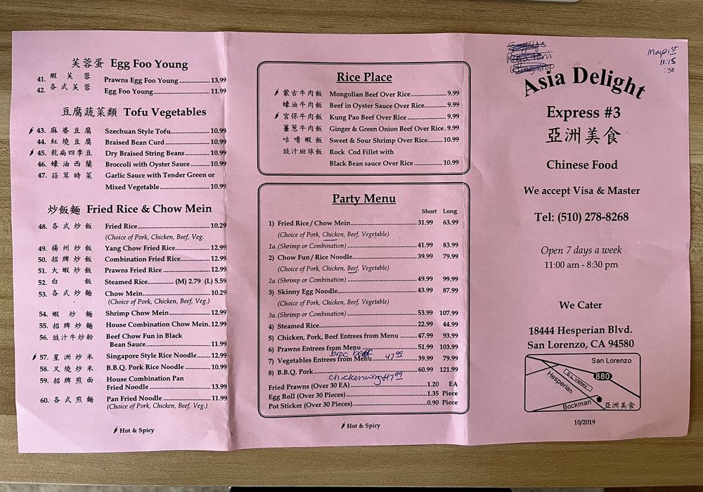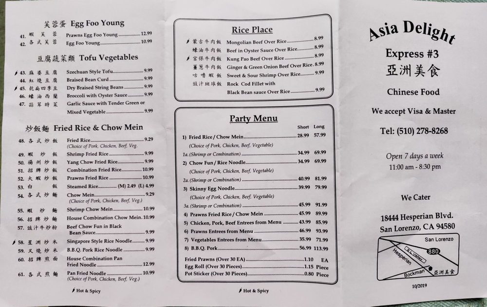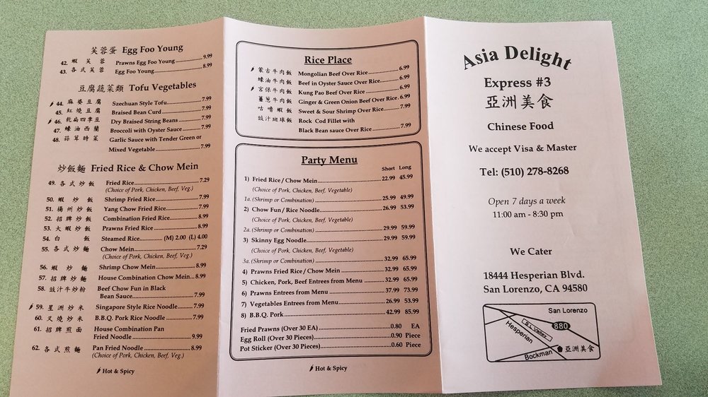 Asia Delight Express Three is a Chinese restaurant located in San Lorenzo, CA, known for its takeout services and wide range of vegetarian options. Customers praise the generous portions and reasonable prices, with favorites like Salt and Pepper Wings and Orange Chicken standing out. The grilled chicken is a standout, offering freshness and flavor in each bite. Despite its unassuming exterior, the restaurant offers a cozy atmosphere with ample seating options. The cafeteria-style setup allows customers to customize their orders, making it a popular choice for quick and satisfying Chinese food. With positive reviews emphasizing the savory dishes and friendly service, Asia Delight Express Three is a must-try for fans of authentic Chinese cuisine.